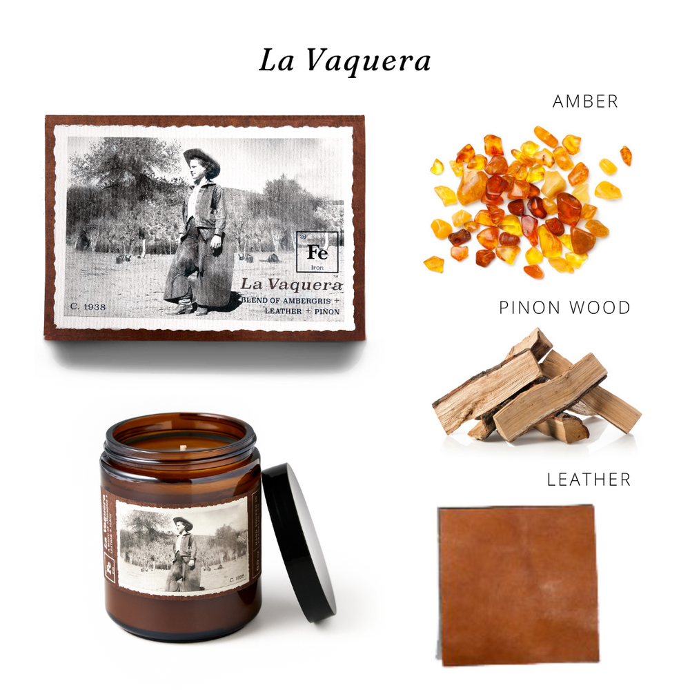 Confident. Bold. La Vaquera is full of life. Tones of Ambergris bring out the bright citrus essence while balancing notes of leather and cedar pair perfectly with rich pinion wood.